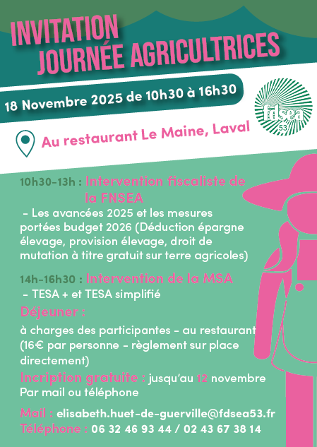 Inscription gratuite (jusqu’au 12 novembre) : elisabeth.huet-de-guerville@fdsea53.fr / 06 32 46 93 44 / 02 43 67 38 14