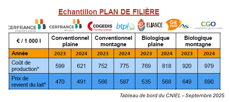 Cet indicateur est issu d’un traitement de données réalisé par l’IDELE à partir des données et résultats statistiques fournis par les centres de gestion et organismes de conseil en élevage. Ils sont issus de clôtures d’exercices comprises entre le 31/03/2024 et le 31/12/2024. Il est validé par les 4 collèges de l’interprofession et est donc la référence pour la prise en compte des coûts de production des éleveurs dans les formules de calcul du prix du lait.