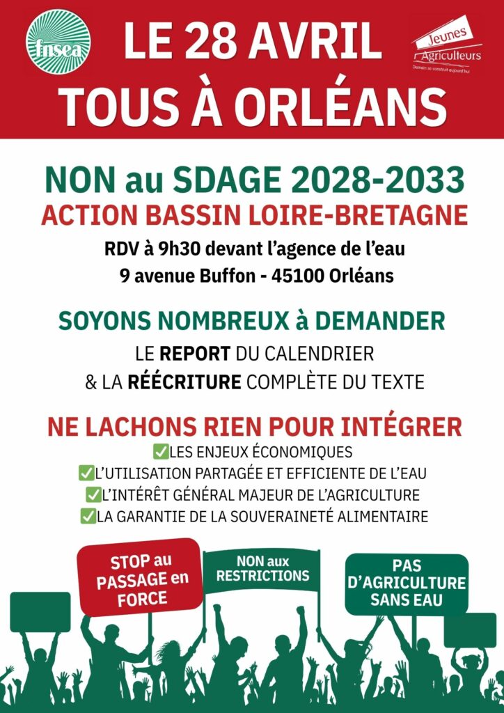 La rédaction du SDAGE ignore les remarques du monde agricole, alors même que l’agriculture relève de l’intérêt général majeur. Nous refusons que soient écartées des solutions concrètes comme le stockage de l’eau, outil indispensable de gestion et d’adaptation face au changement climatique. Nous vous attendons donc nombreux à Orleans pour manifester contre: