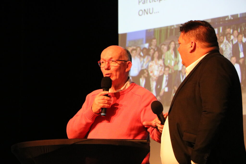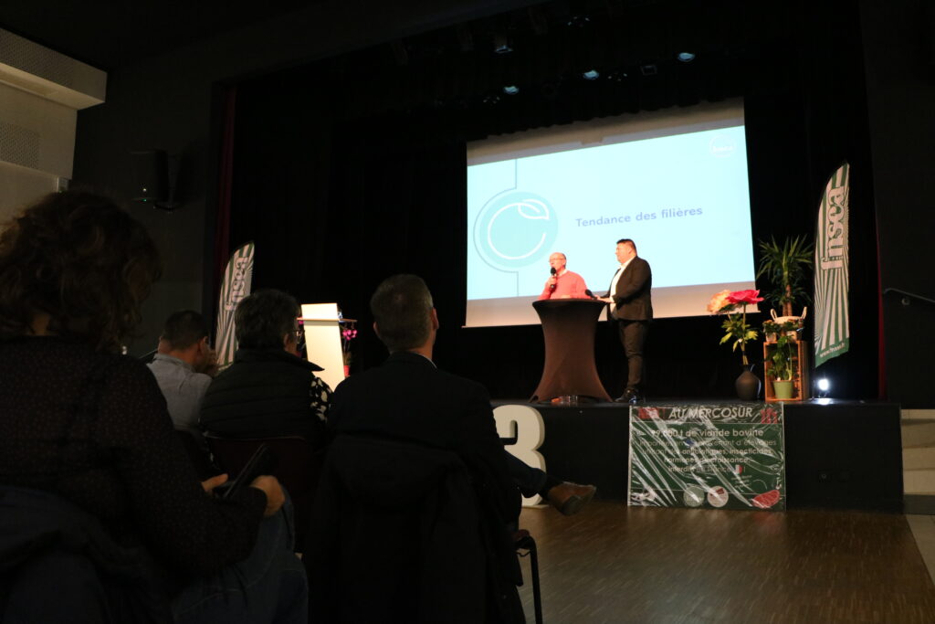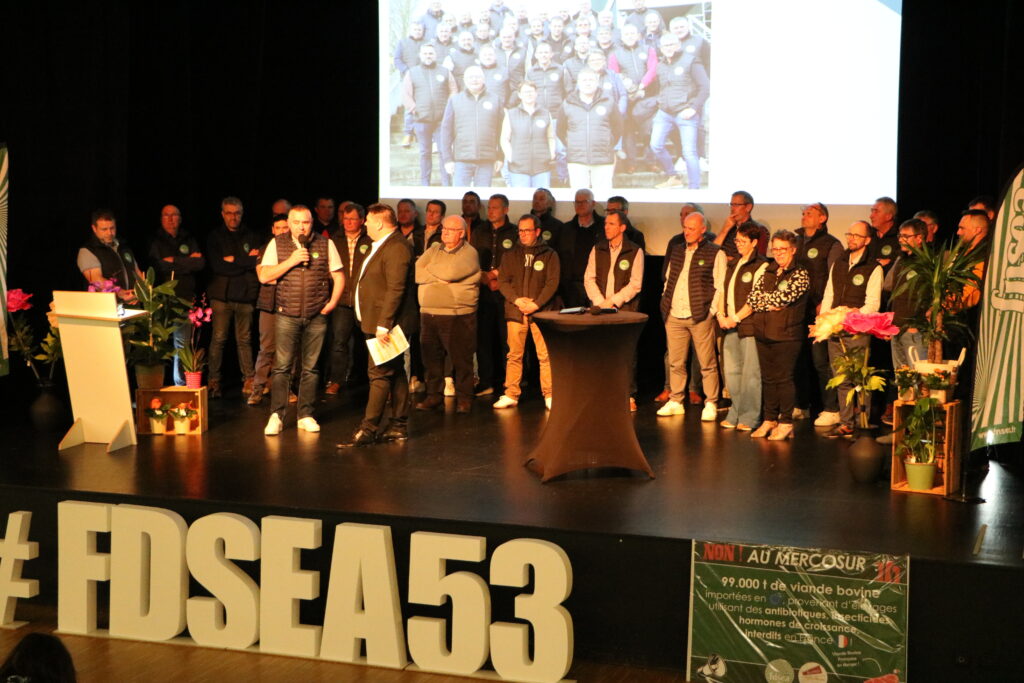 Erwan Pineau, nouveau président des JA 53, a rejoint Samuel sur scène pour réaffirmer la complémentarité de nos réseaux : l’énergie et la vision des Jeunes Agriculteurs alliées à l’expérience et la force de représentation de la FDSEA.