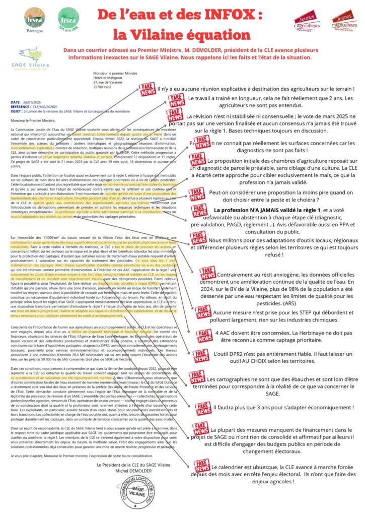 Cette décision s’inscrit dans un contexte déjà tendu, renforcé fin janvier par l’envoi par le président de la CLE, M. Demolder, d’un courrier adressé au plus haut niveau de l’État et comportant plusieurs affirmations inexactes sur le SAGE Vilaine. Nous devons rappeler publiquement les faits et corriger ces éléments, tant ils contribuent à fausser le débat et à alimenter des représentations erronées de la situation réelle.